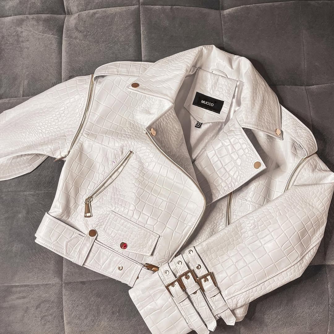 Geacă biker din piele naturală albă cu textură croco