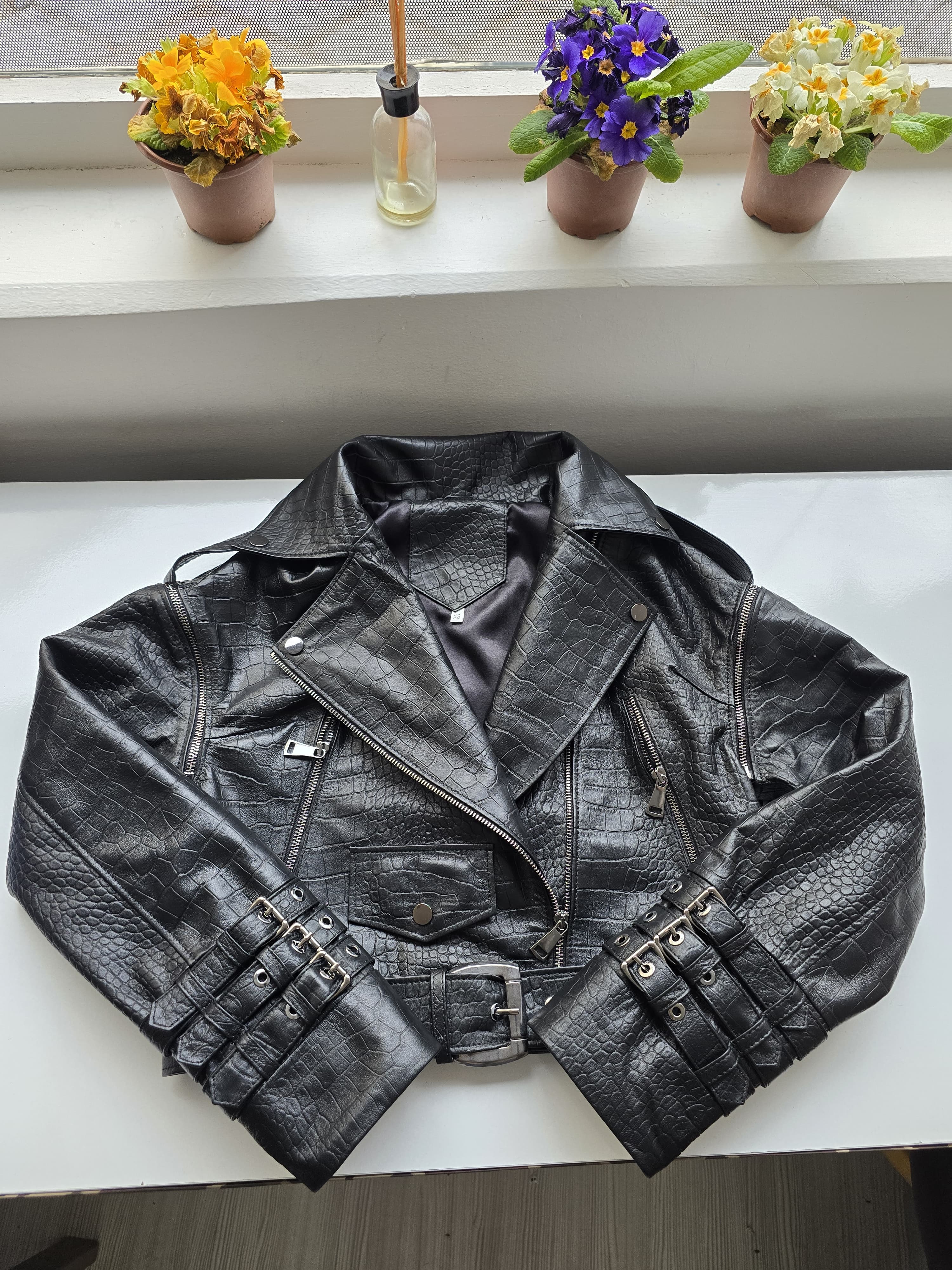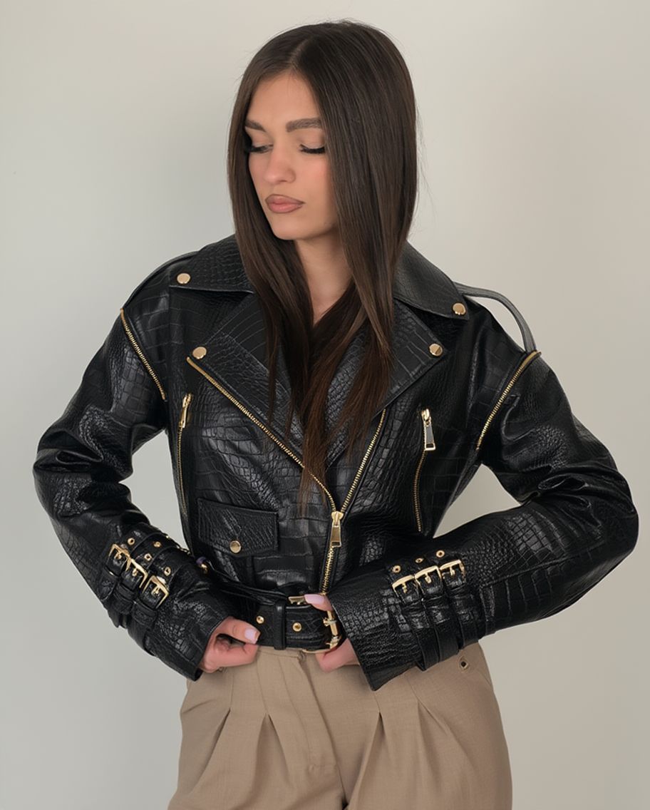 Jachetă biker din piele neagră cu relief de crocodil