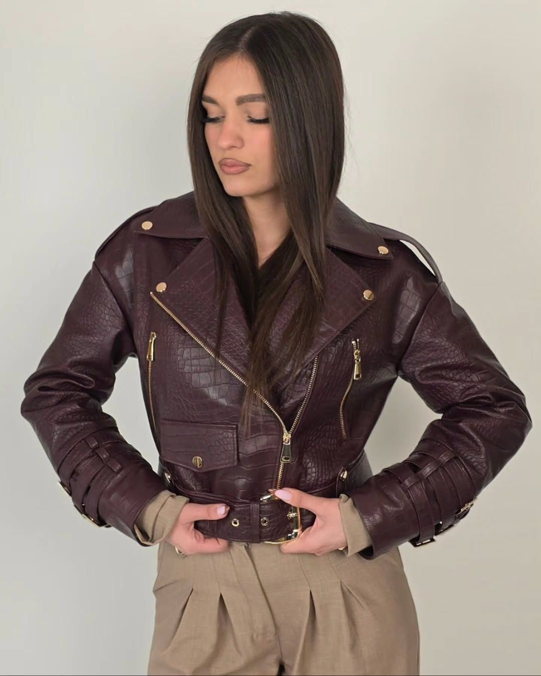Geacă din piele naturală texturată – Burgundy Croco Edition