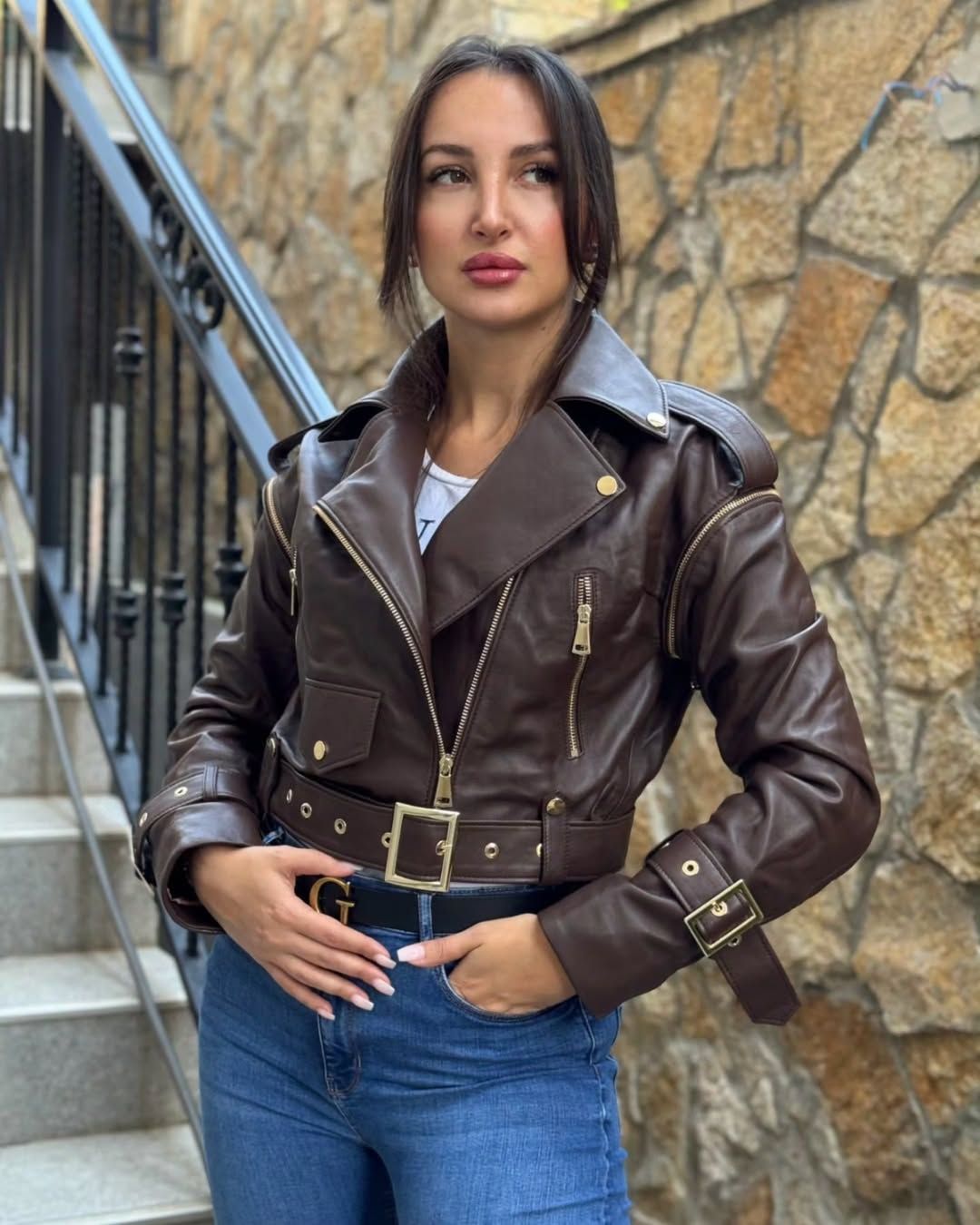 Geacă din piele naturală maro – stil biker cu detalii aurii