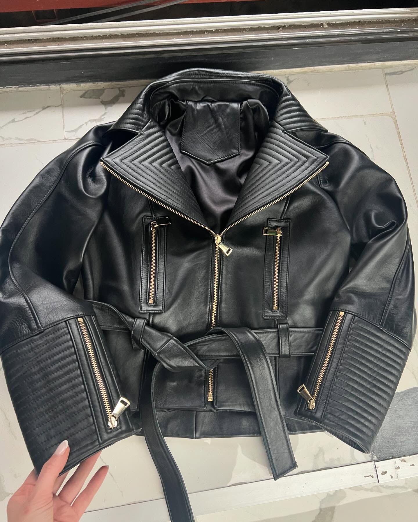 Accented with stylish gold hardware, the jacket exudes an aura of luxury. The gold zippers and buttons not only serve a functional purpose but also elevate the overall elegance of the design.