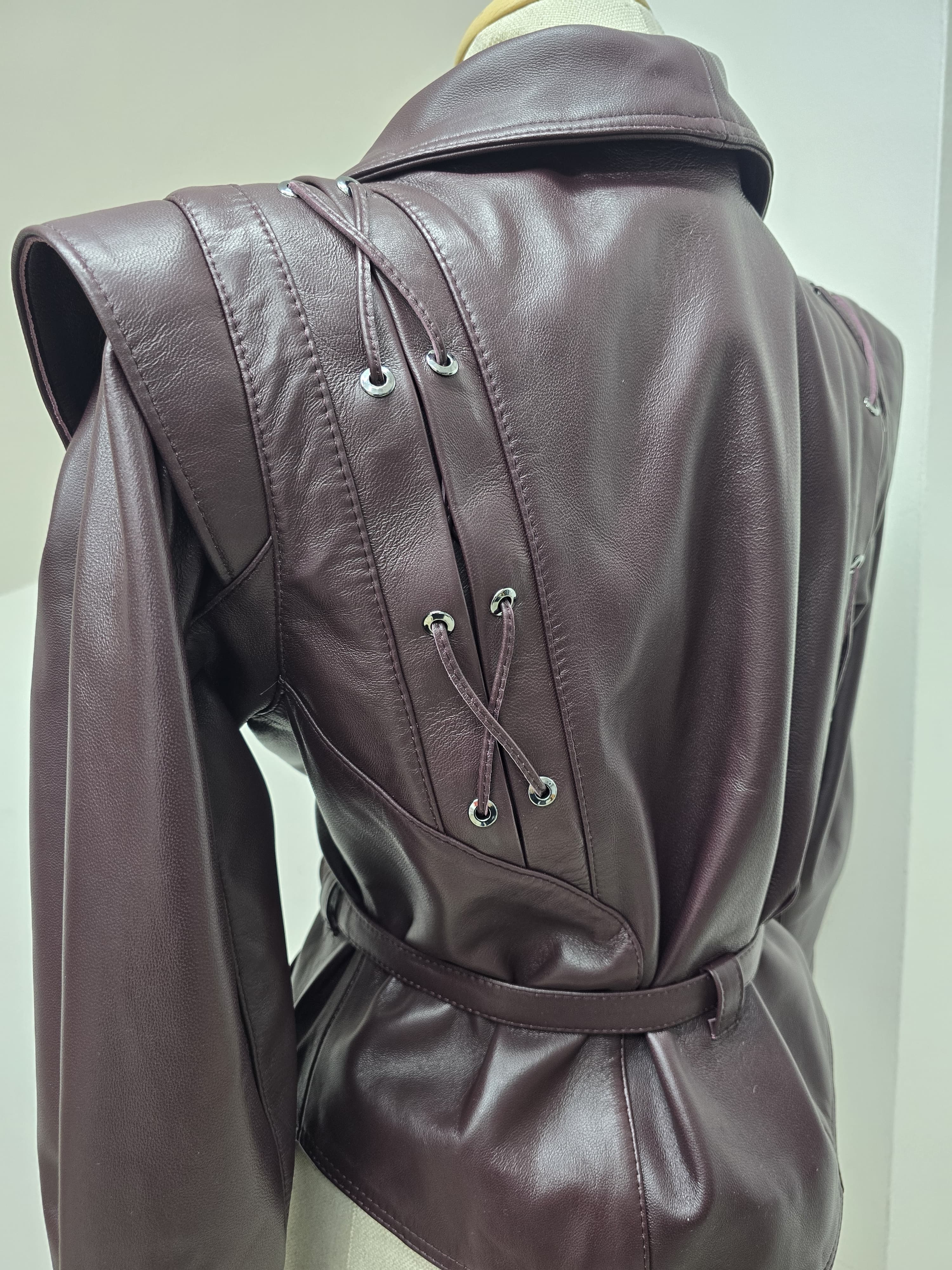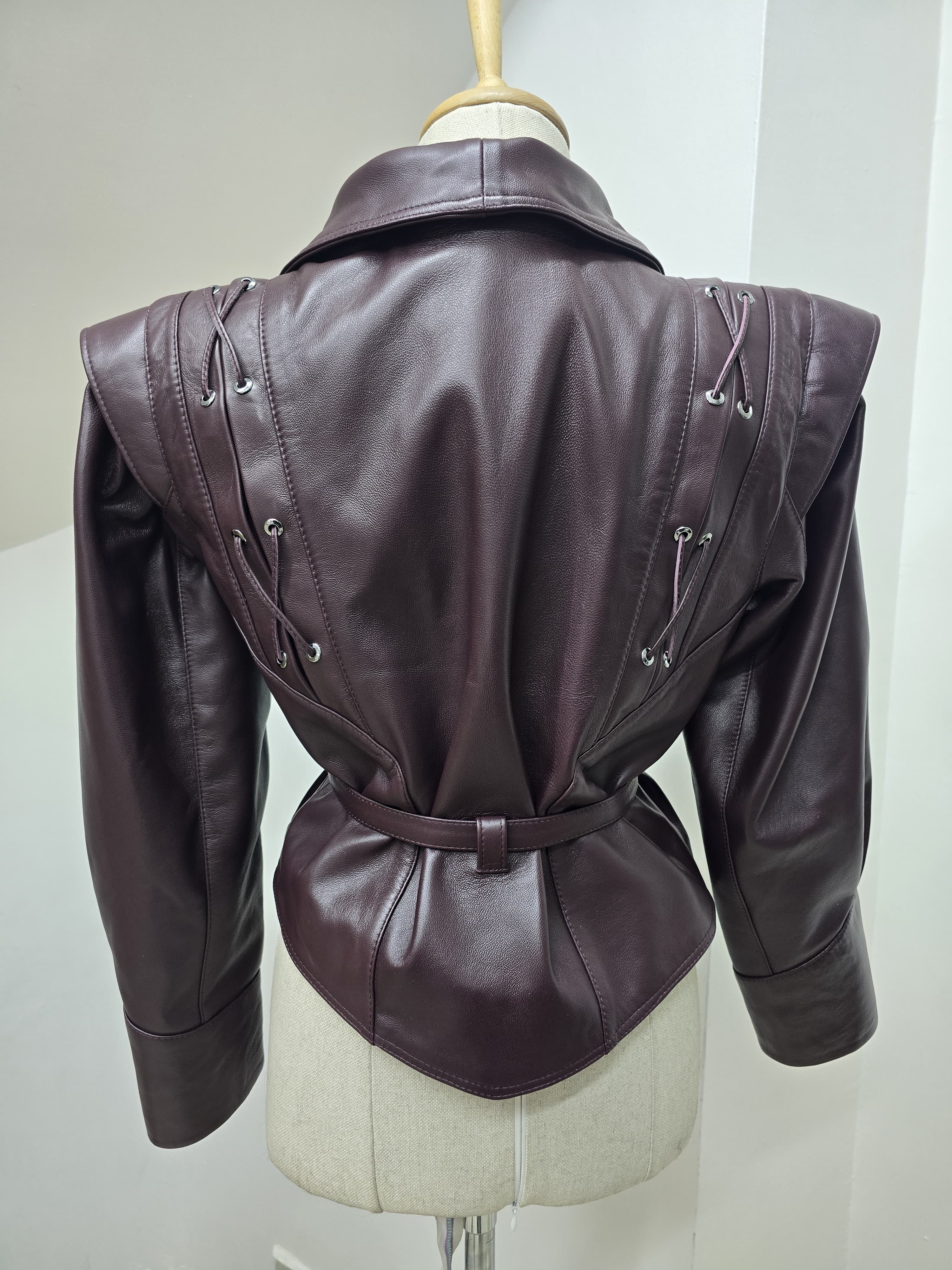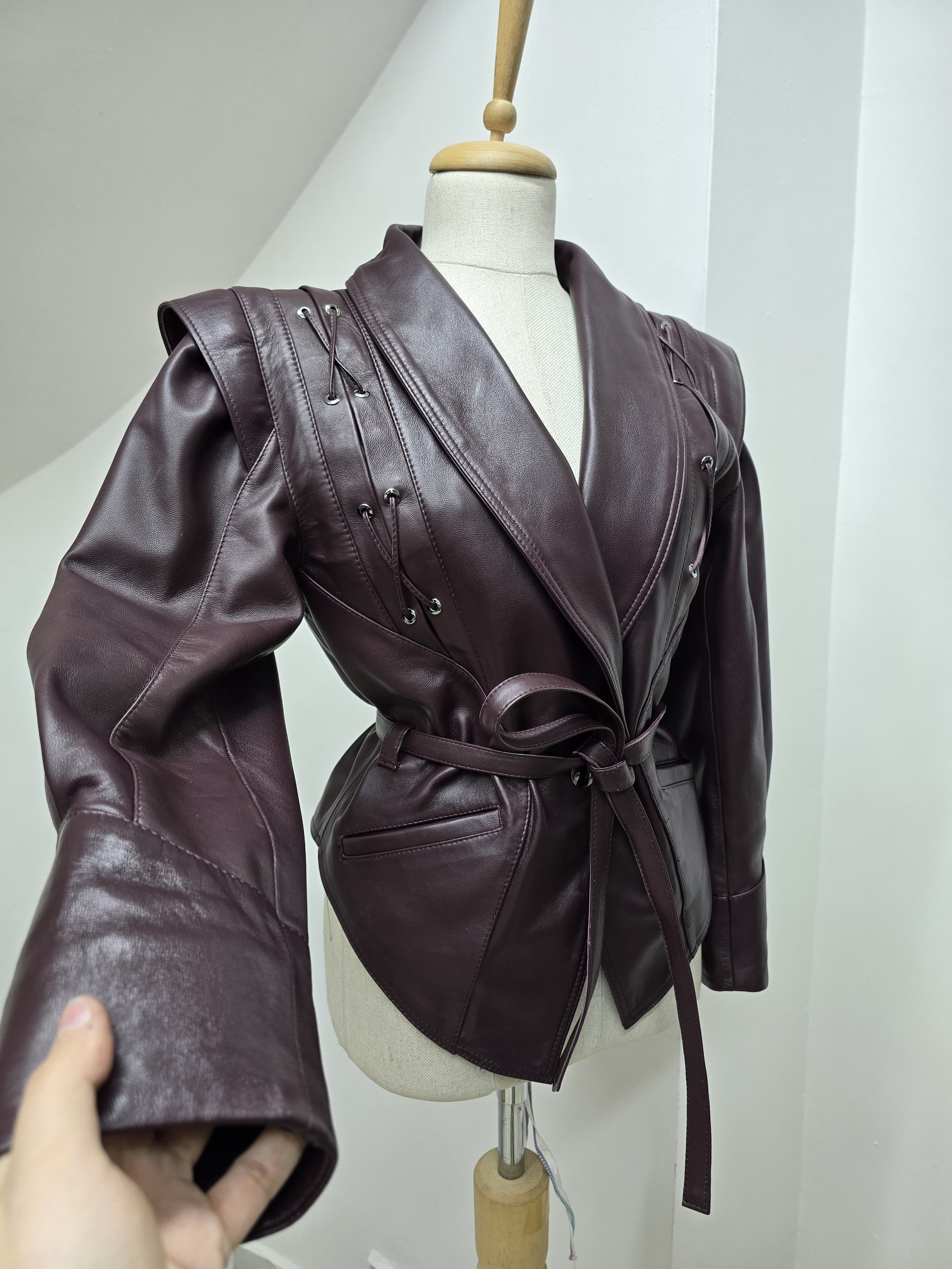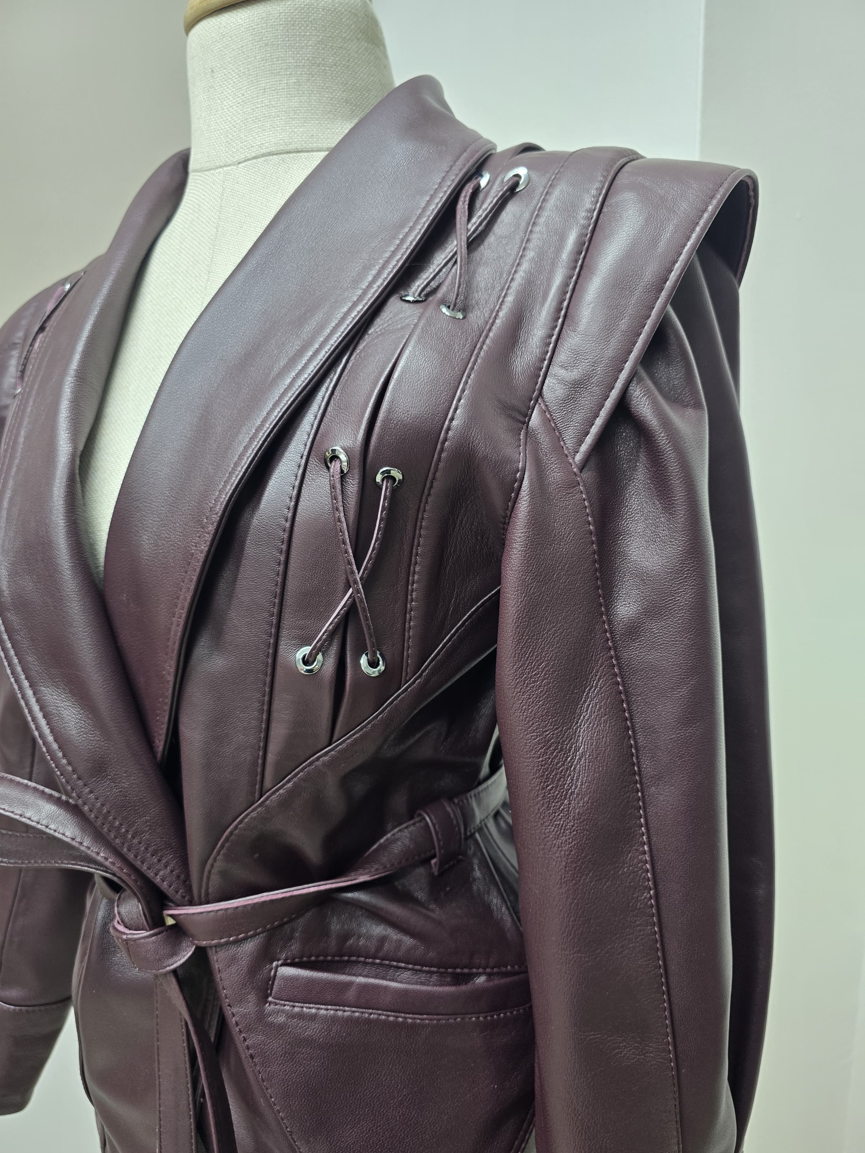 Îmbunătățește-ți garderoba cu sofisticația îndrăzneață a Jachetei din Piele Crimson Edge. Creată dintr-o piele autentică de premium într-o nuanță bogată de burgundy, această jachetă dispune de umeri structurați, detalii complexe cu șiret pe lateral și o curea strânsă în talie care sculpta o siluetă puternică. Perfectă pentru femeile care îmbrățișează puterea și eleganța, acest articol deosebit combină fără efort modernitatea cu luxul atemporal. Poart-o cu pantaloni eleganți sau o rochie simplă pentru un look de neuitat.