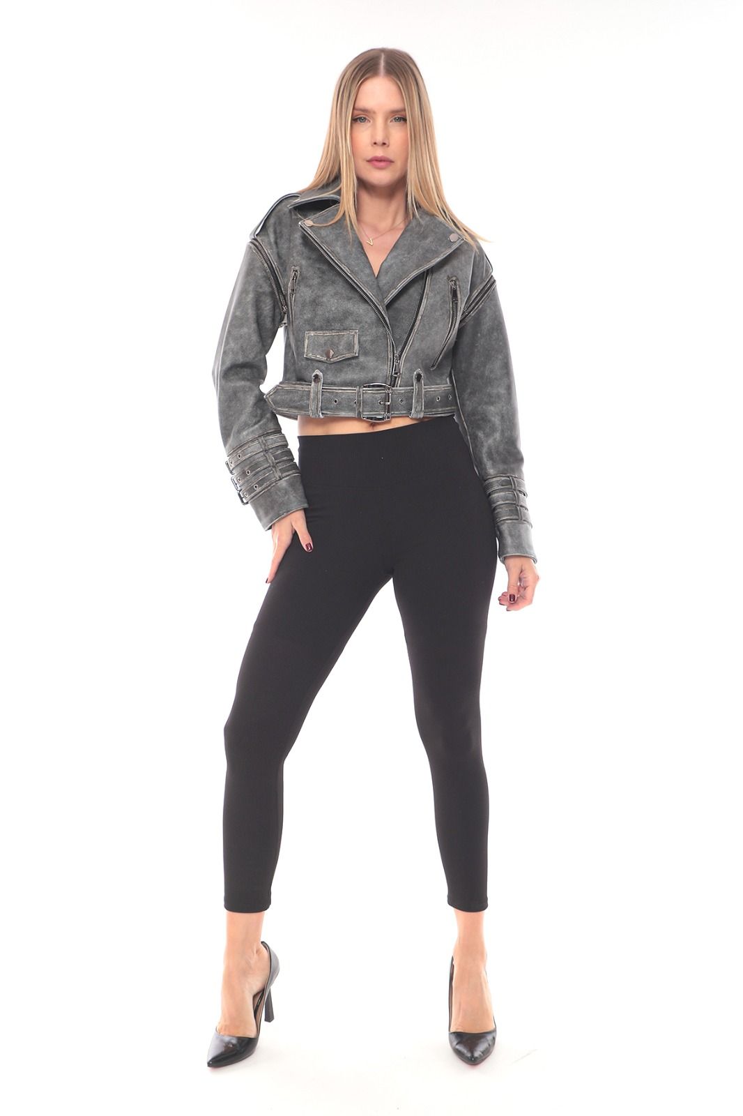 Această jachetă din piele într-o nuanță gri vintage redefinește stilul clasic biker printr-un design modern și feminin. Croiala scurtă evidențiază talia, iar detaliile cu fermoare și catarame multiple pe mâneci oferă un aer îndrăzneț și sofisticat.