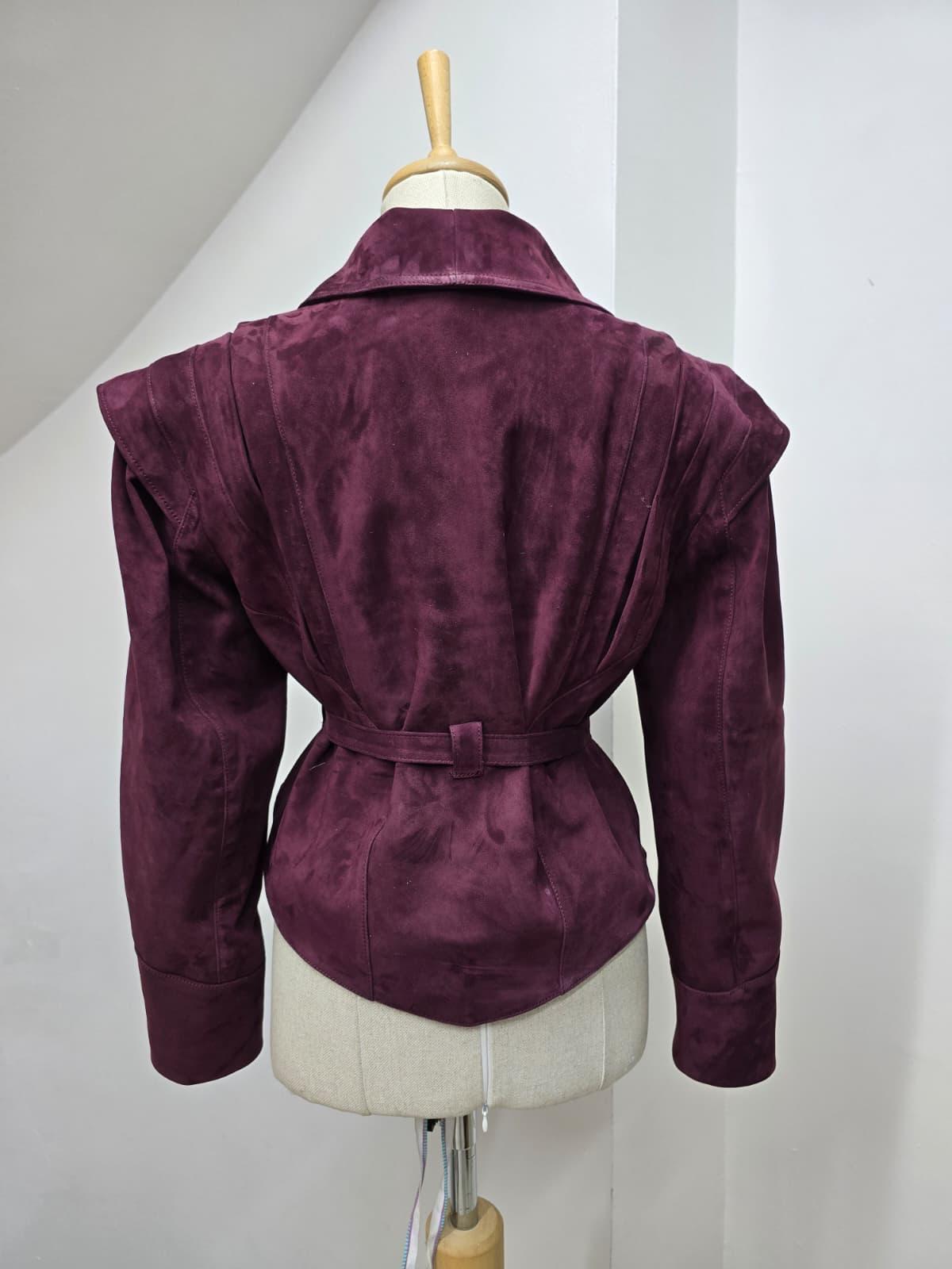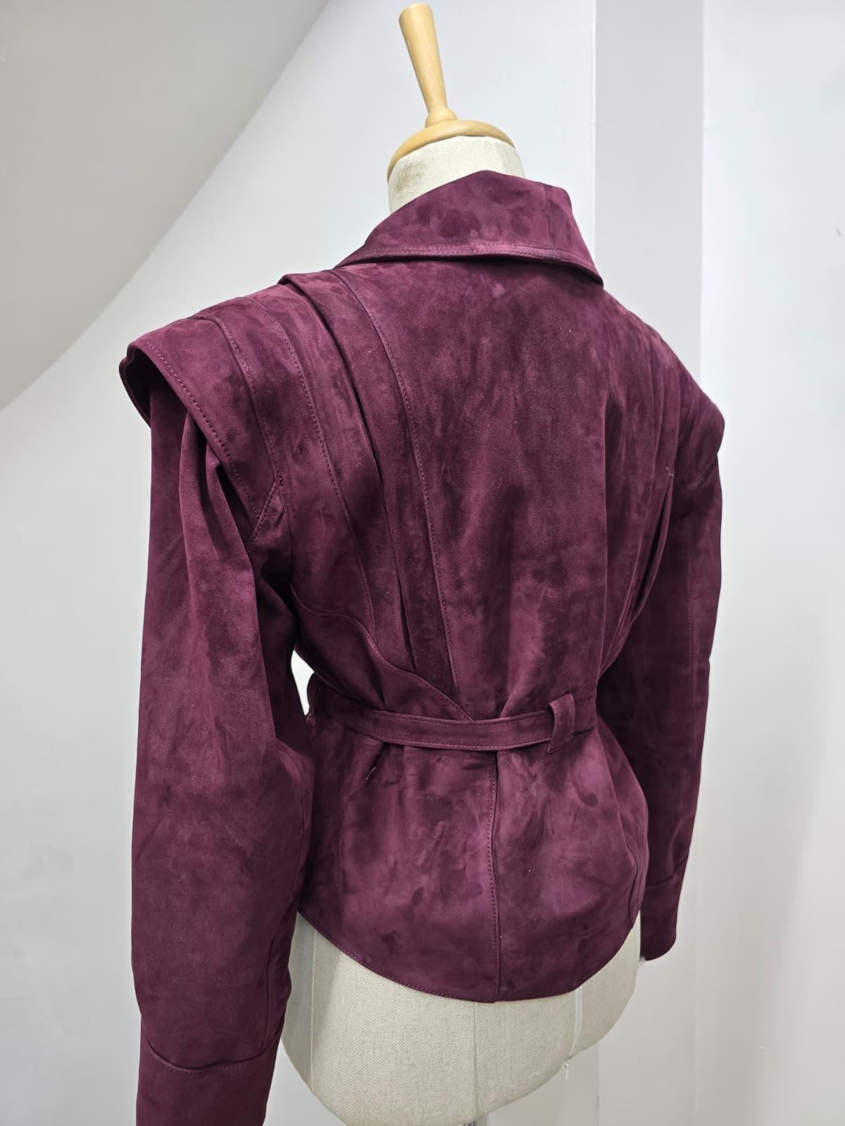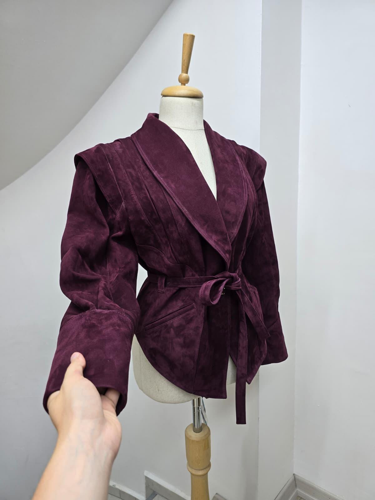Geacă din piele întoarsă naturală, într-o nuanță elegantă burgundy.