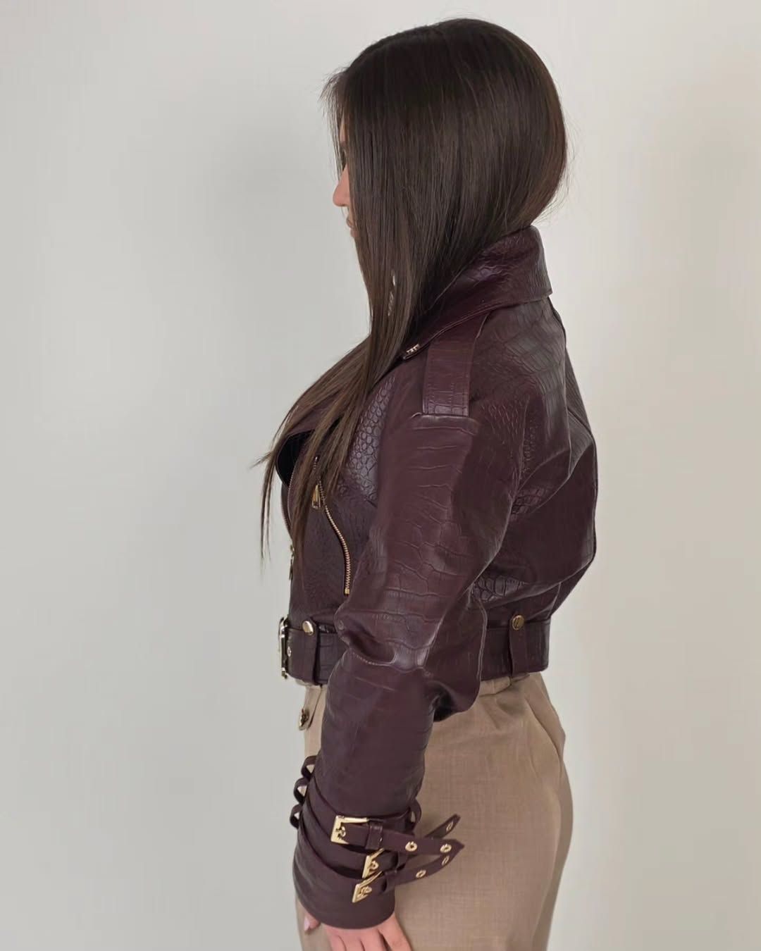 Geacă scurtă din piele naturală cu textură tip croco, într-o nuanță elegantă burgundy închis.