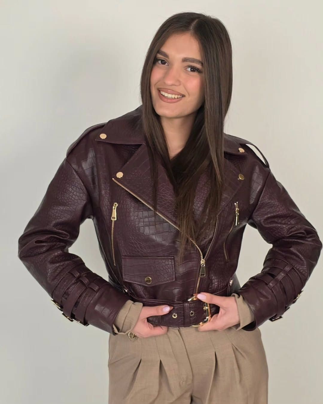Design biker modern, cu fermoare aurii, cataramă reglabilă în talie și detalii atent lucrate.
