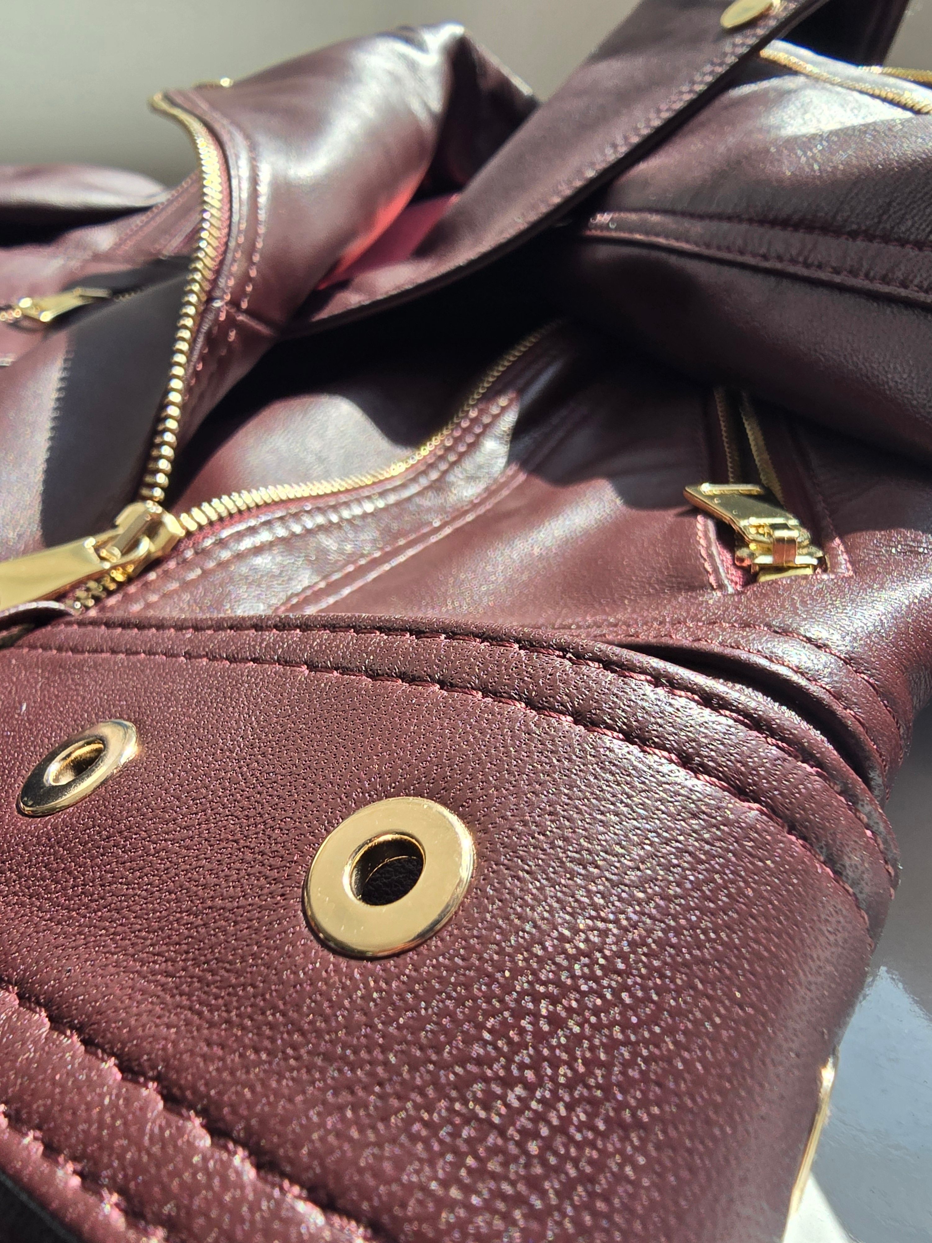 Cufundați-vă în declarația supremă de sofisticare și stil cu această jachetă de biker din piele Nappa Burgundy, meticulos lucrată. Fabricată din piele Nappa de calitate superioară, renumită pentru textura sa moale și senzația luxoasă, această jachetă este o adevărată lucrare de artă. Nuanta bogată, profundă de burgundy, combinată cu accesorii aurii elegante, creează un aspect atemporal care emană atât eleganță, cât și inspirație îndrăzneață.