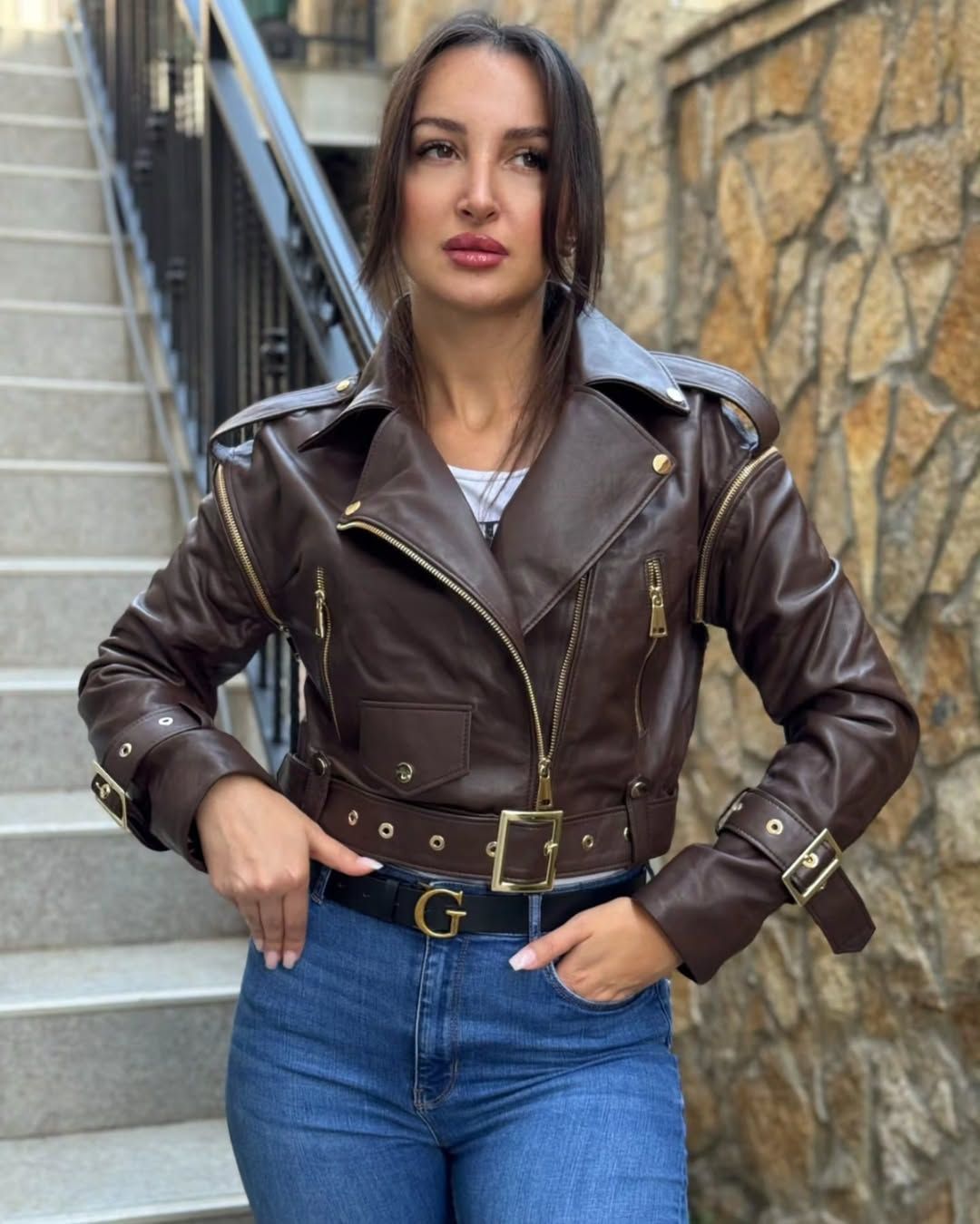 Design tip biker, cu fermoare metalice, cataramă reglabilă în talie și detalii aurii premium.