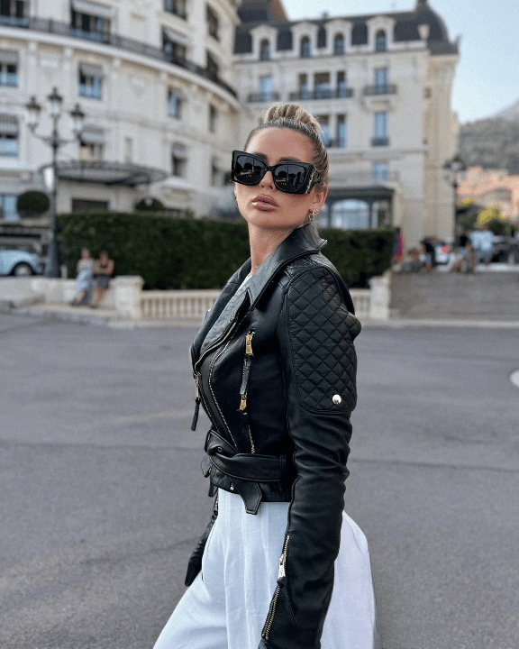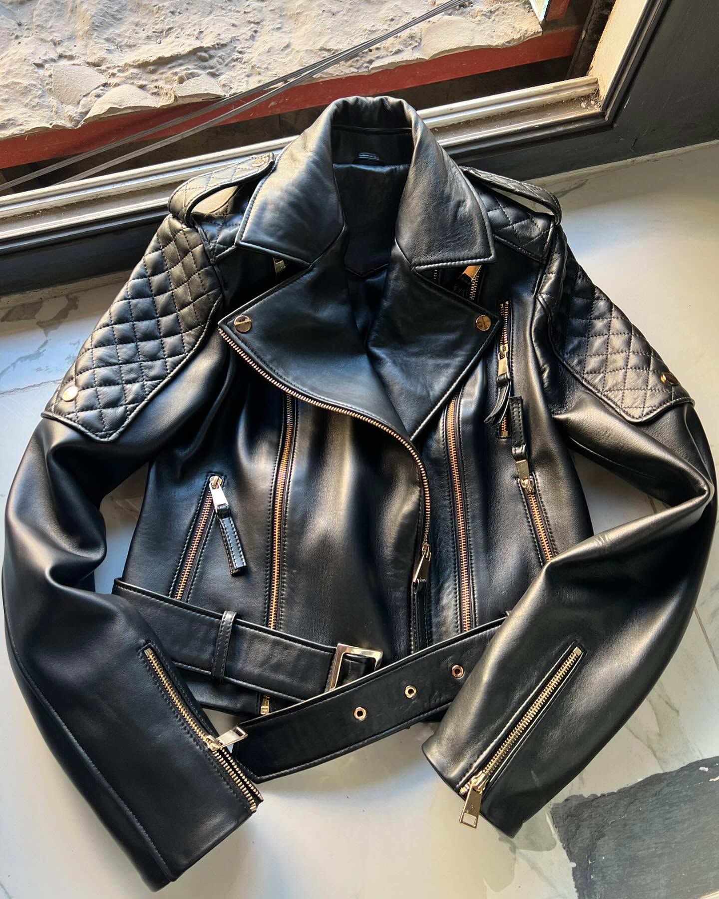 Elevate your wardrobe with our slim fit black leather jacket for women made from genuine leather. This jacket features distinctive leather embroidery on the shoulder and luxurious gold accessories, making it a must-have piece for any fashion-forward individual. Perfect for both casual and formal occasions, it combines style with comfort.