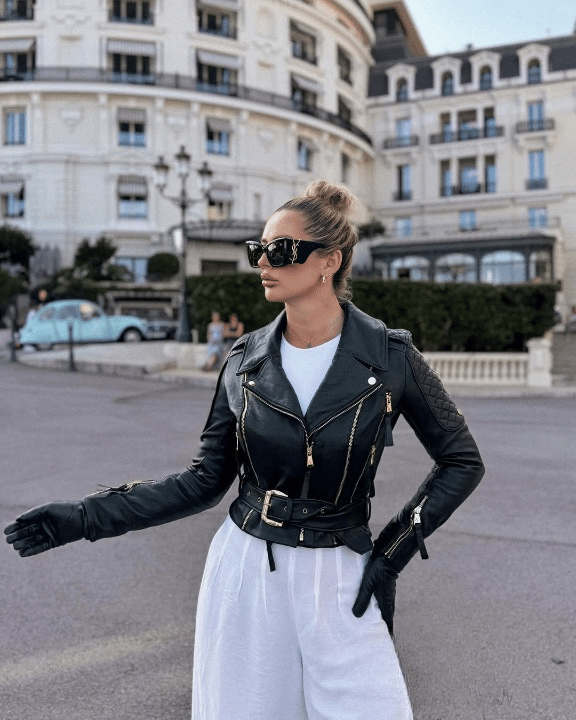 Dress it up or down—this black leather jacket can be paired with jeans for a casual outing or over a dress for a night out, offering versatility in styling.