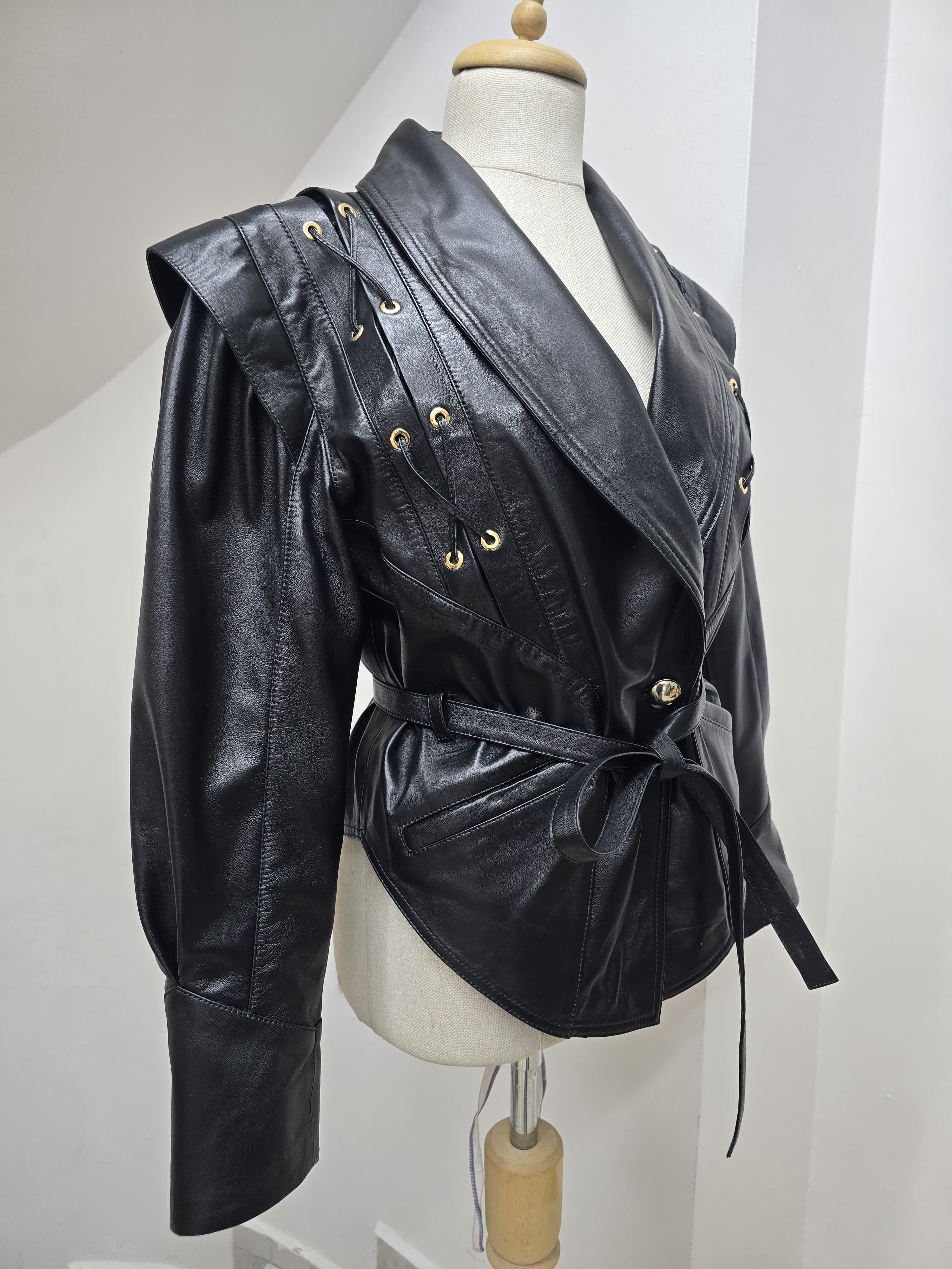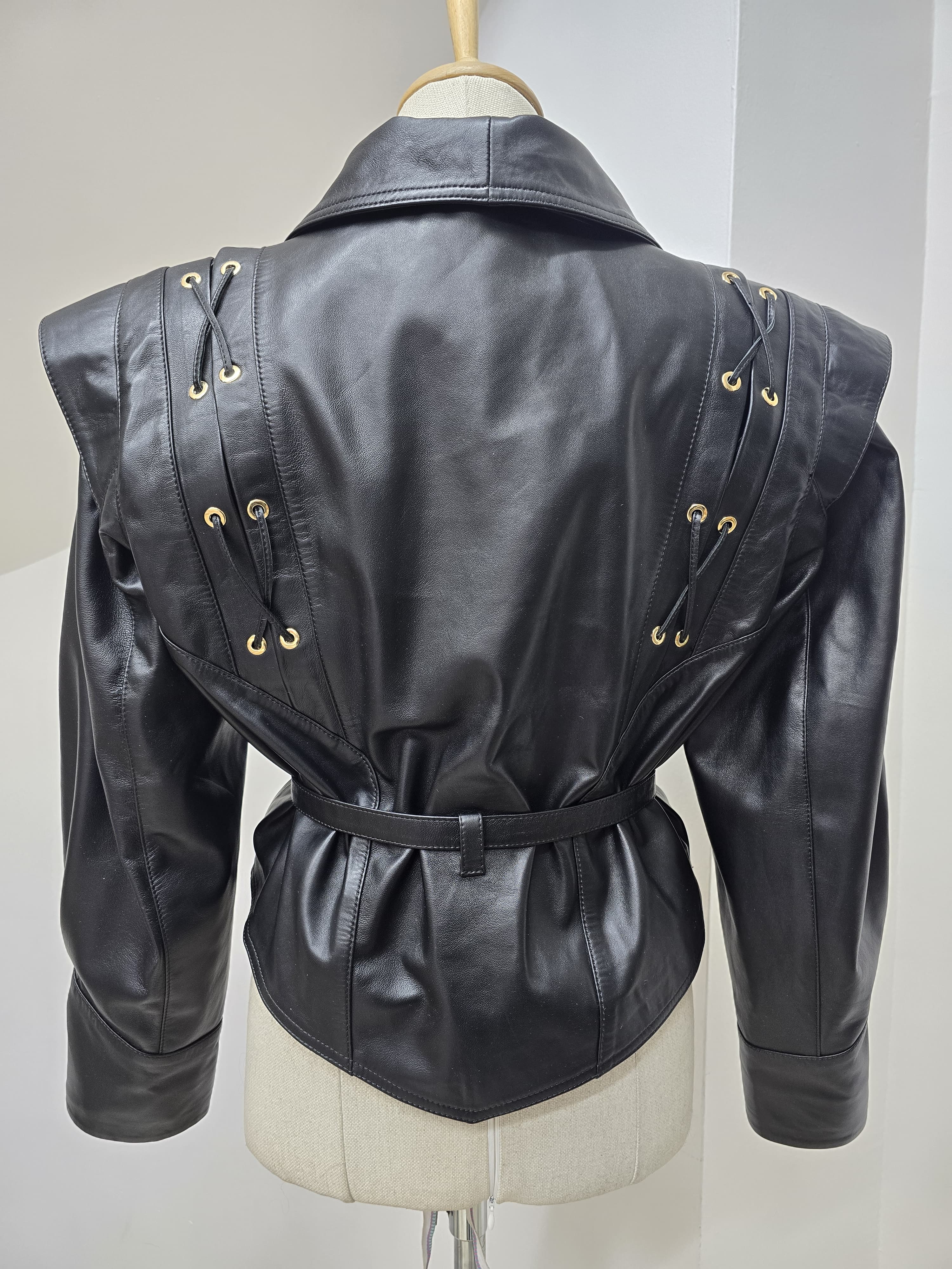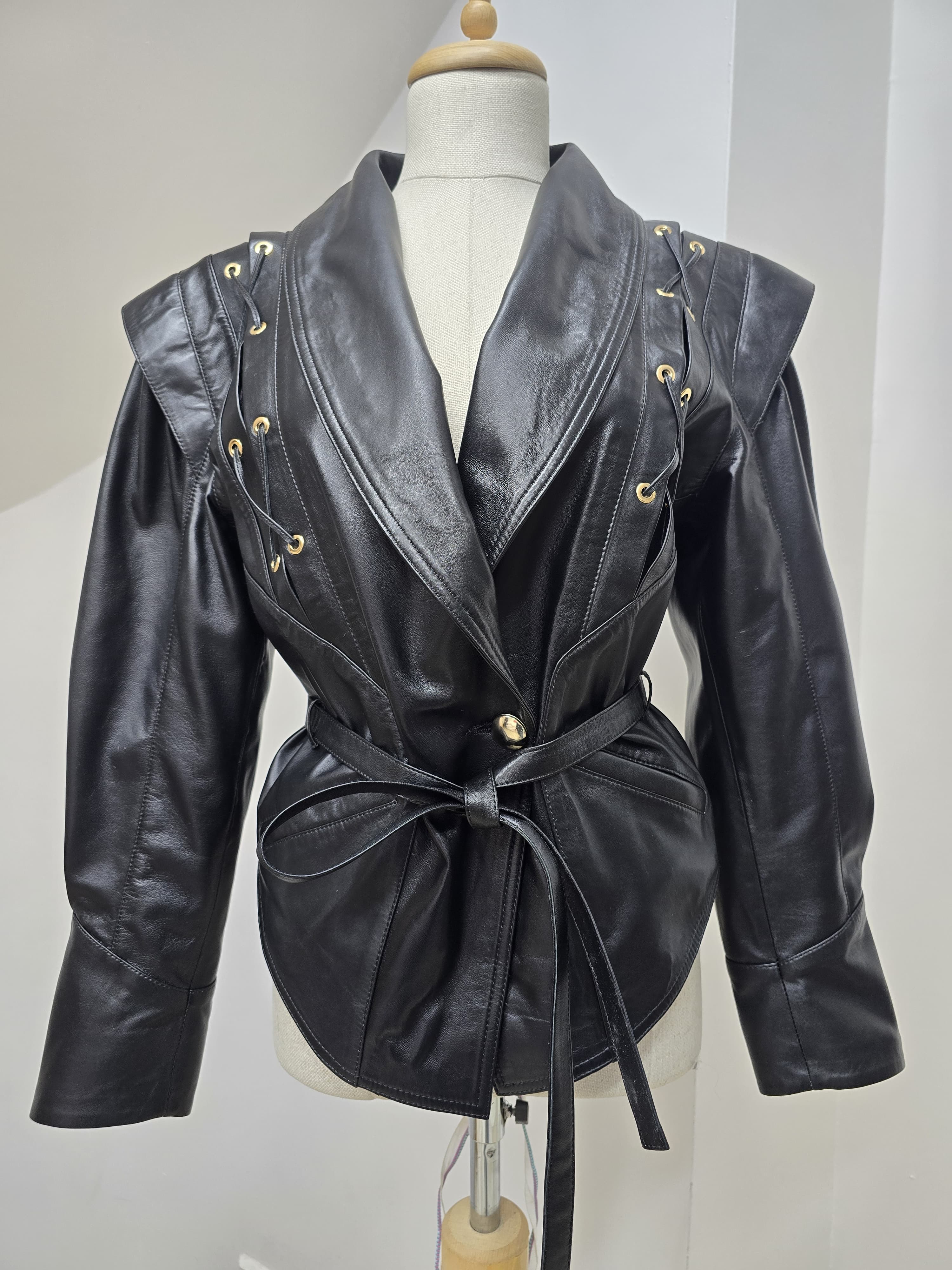 Make a statement with this stunning black leather jacket, crafted for those who embrace confidence and individuality. Designed with structured shoulders, gold eyelet lace-up details, and a sleek adjustable waist belt, this jacket exudes sophistication with a rebellious edge.