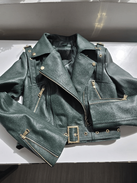 Command attention in Z20 Hunter, a cropped biker jacket cut from thick, pebbled genuine leather in a striking forest green hue. Gold-tone zippers, bold hardware, and structured shoulders give this piece its fearless edge.